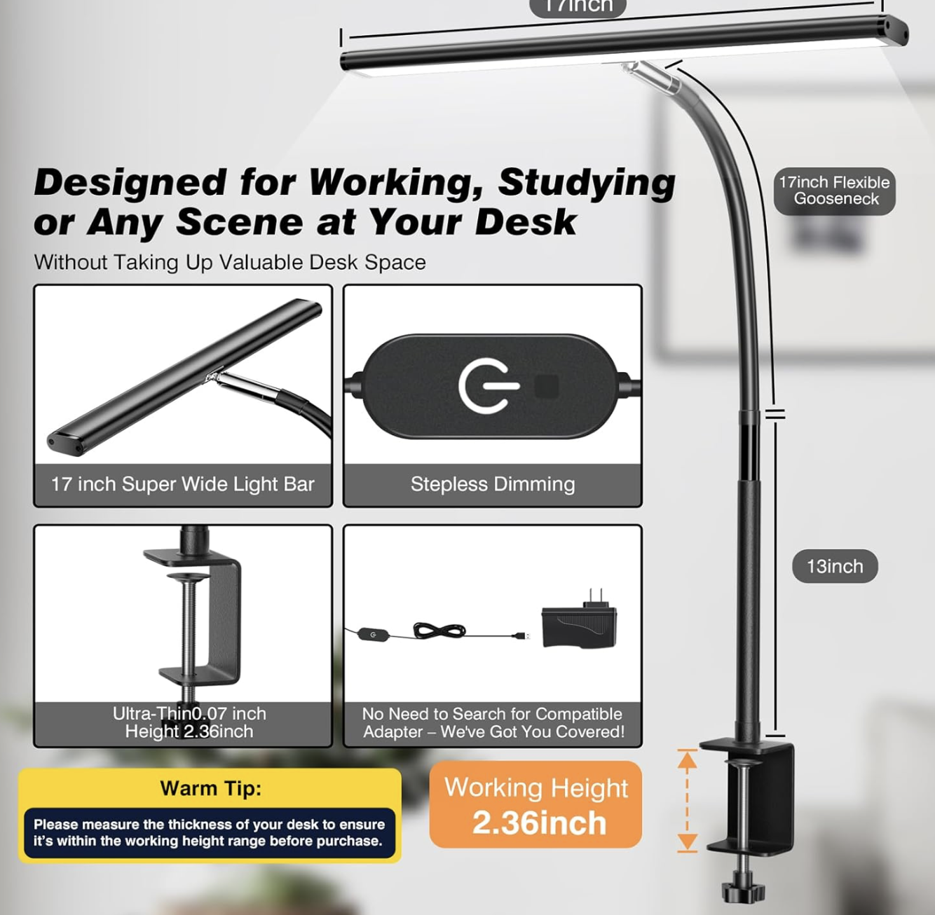 Switched to the AIRLONV Black Gooseneck 10W lamp three months ago and it's transformed my home office routine. No more eye strain or headaches after 10-hour days – the flicker-free light and stepless dimming make a huge difference. The gooseneck holds position perfectly, clamp grips my thick desk edge without slipping, and USB power is super convenient. Best lamp purchase I've made in a long time.